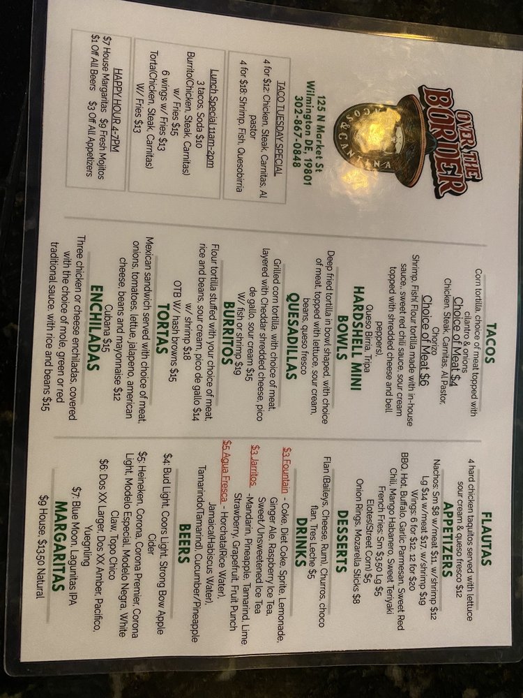Welcome to Over The Border, where dessert meets savory in a delightful fusion! Nestled in Wilmington, DE, this family-owned gem specializes in unique dessert tacos that set them apart from the crowd. Their menu features mouthwatering options, including the ever-popular Churros, crispy deep-fried pastries generously dusted with sugar for just $6.99.